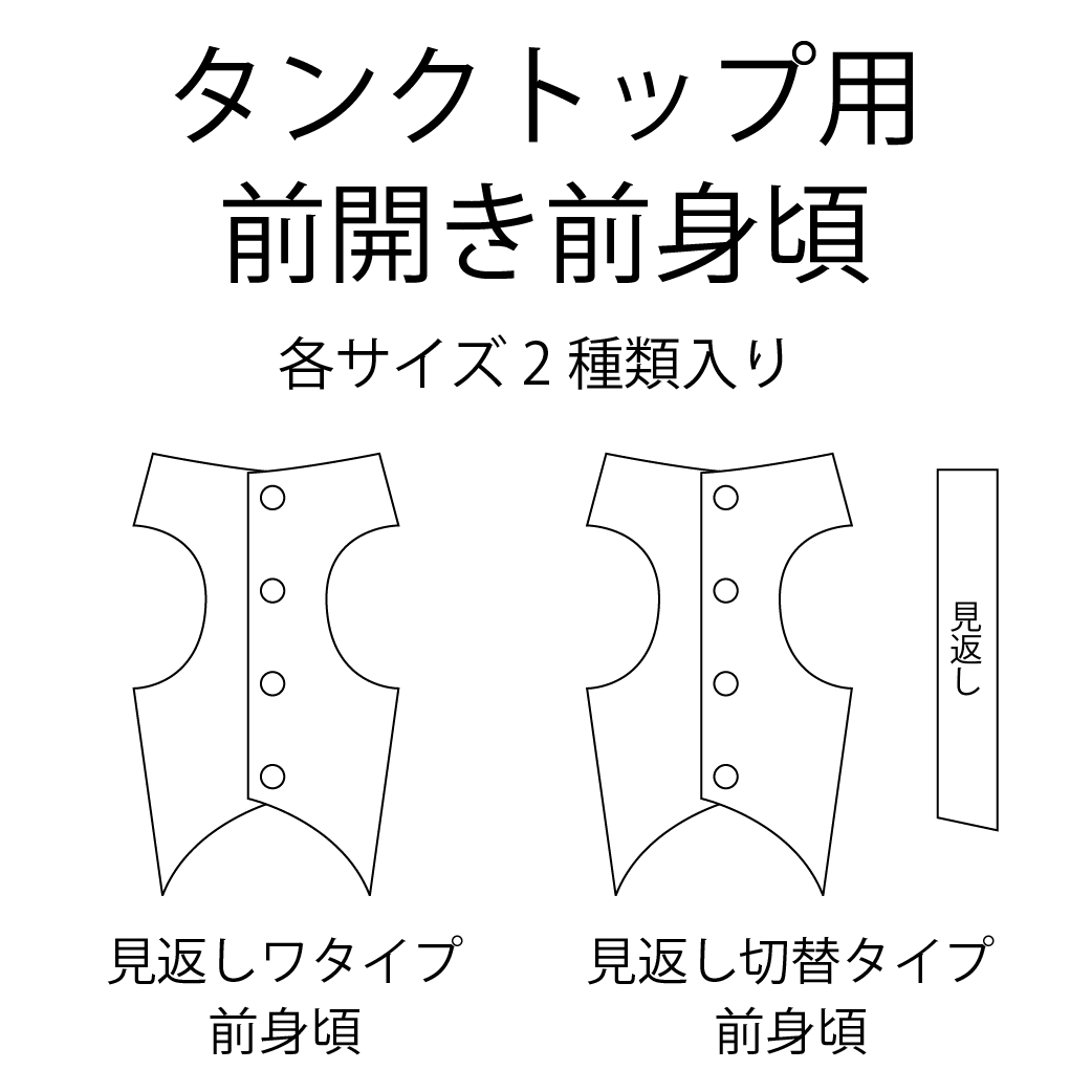 タンクトップ用前開き前身頃・・・見返し付き前身頃と見返し切替の型紙、後身頃の裾見返しの2種類同封されています。