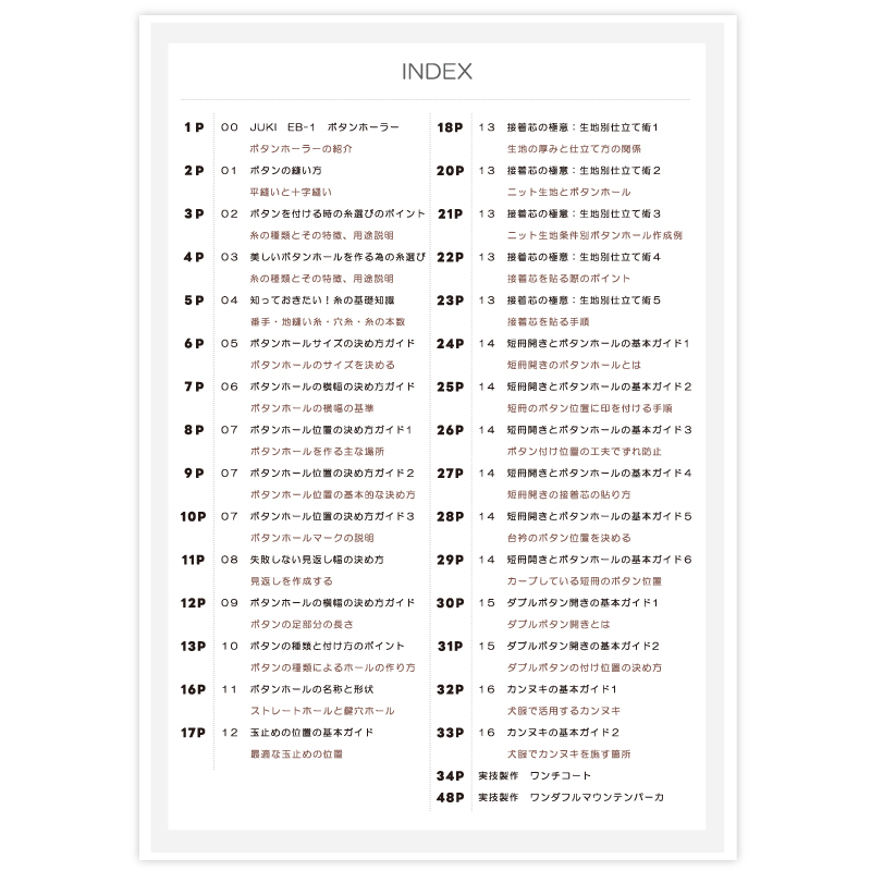 糸の種類や縫い方、ボタンホールやボタンの付け方、見返しの作り方、接着芯の貼り方など、使用する材料やデザインに合わせて自分で考えて作れる技術と知識を解説しています。