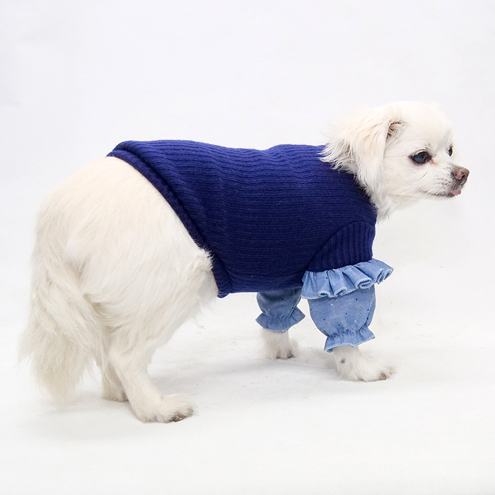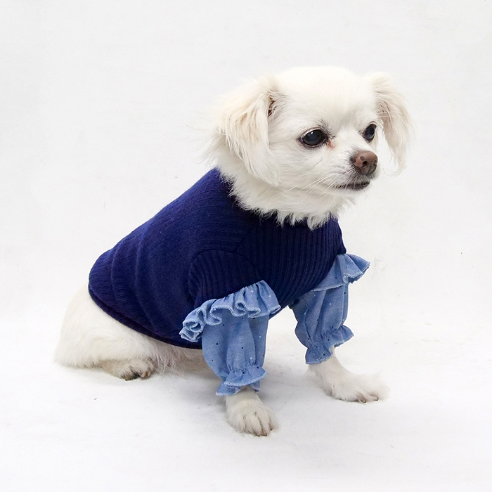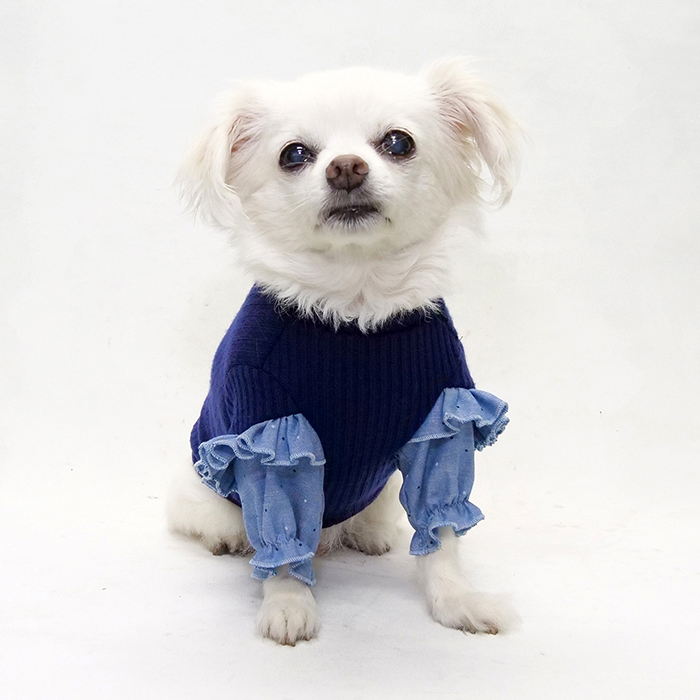身頃と袖の一部にニット生地、フリルと袖に布帛生地を使用して製作しています。